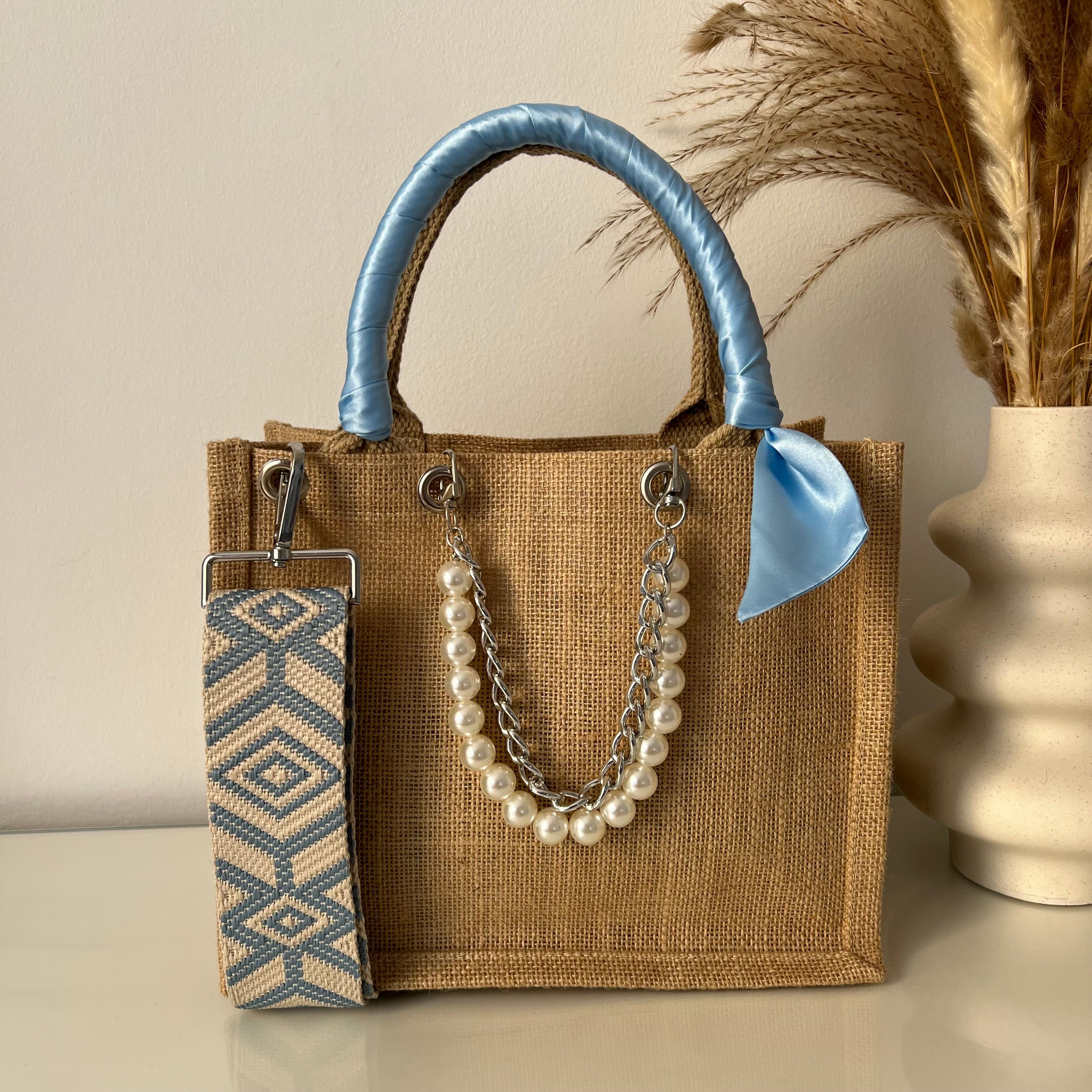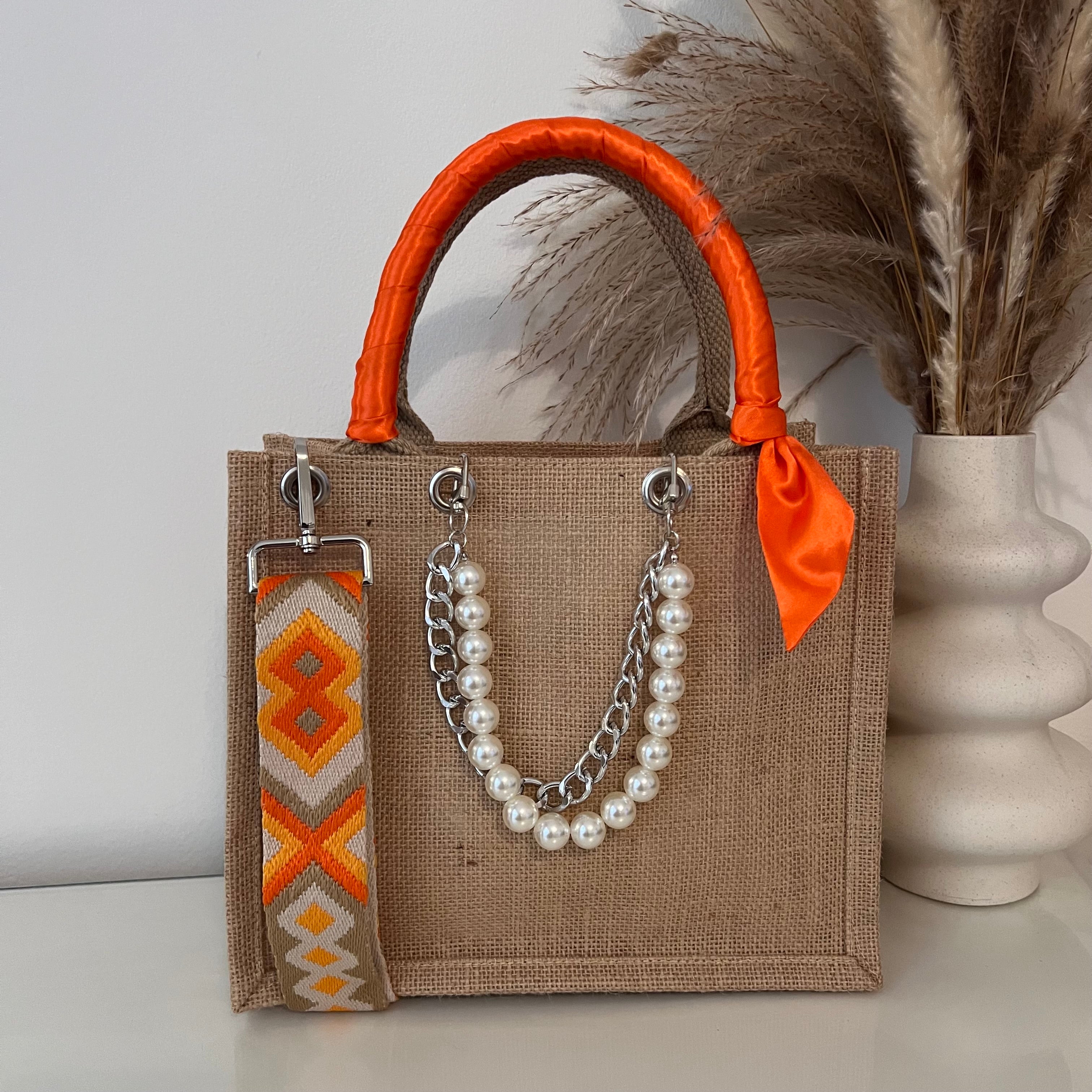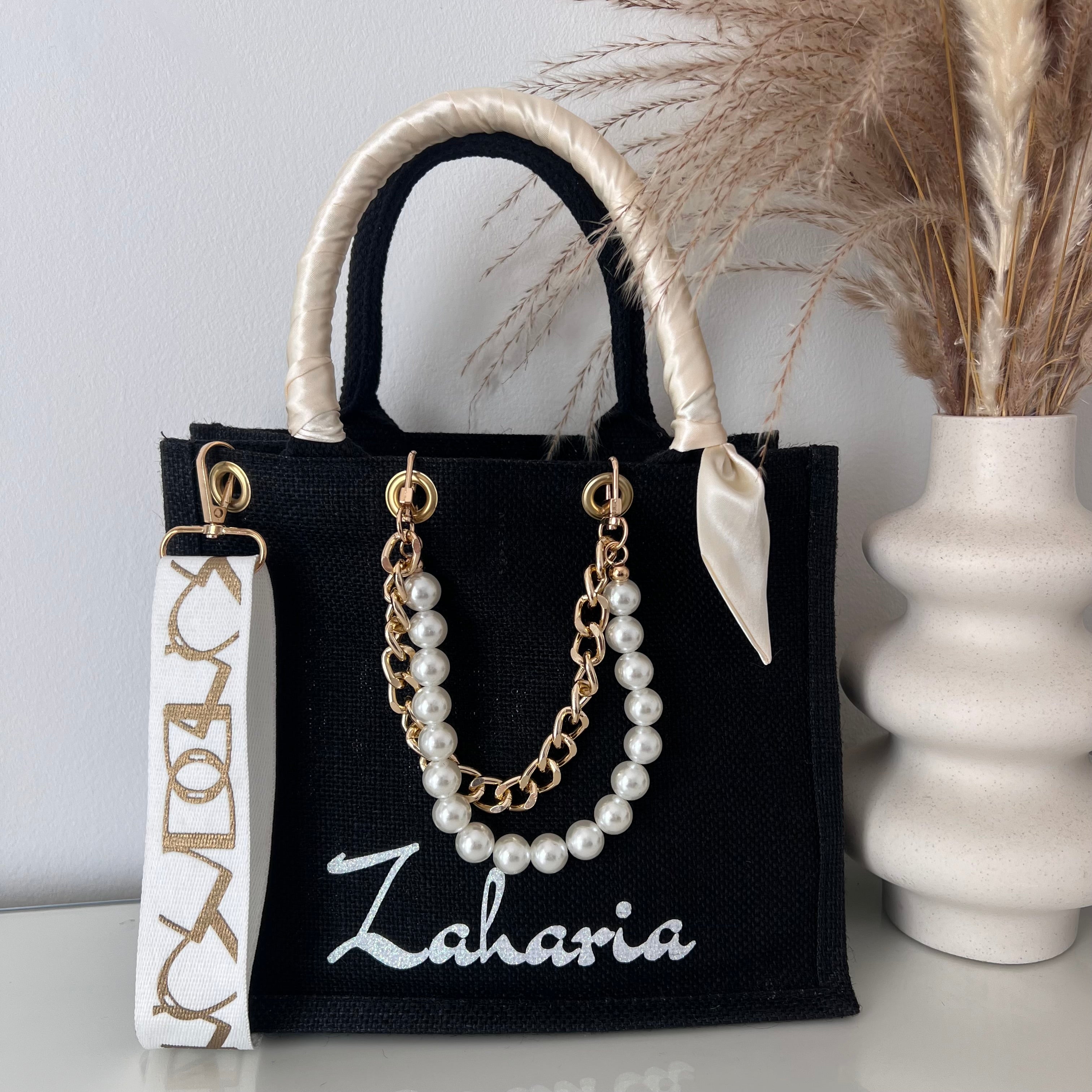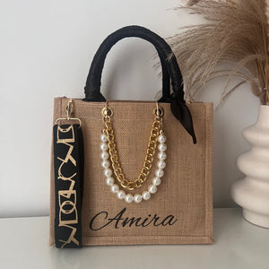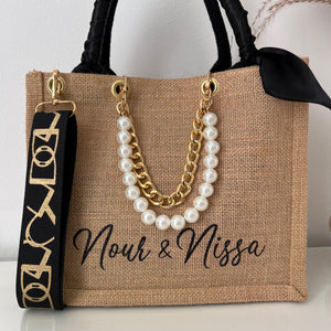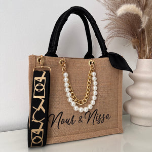 Sac en Jute Personnalisé avec Bijoux , Bandoulière, Foulard et Prénoms personnalisés.