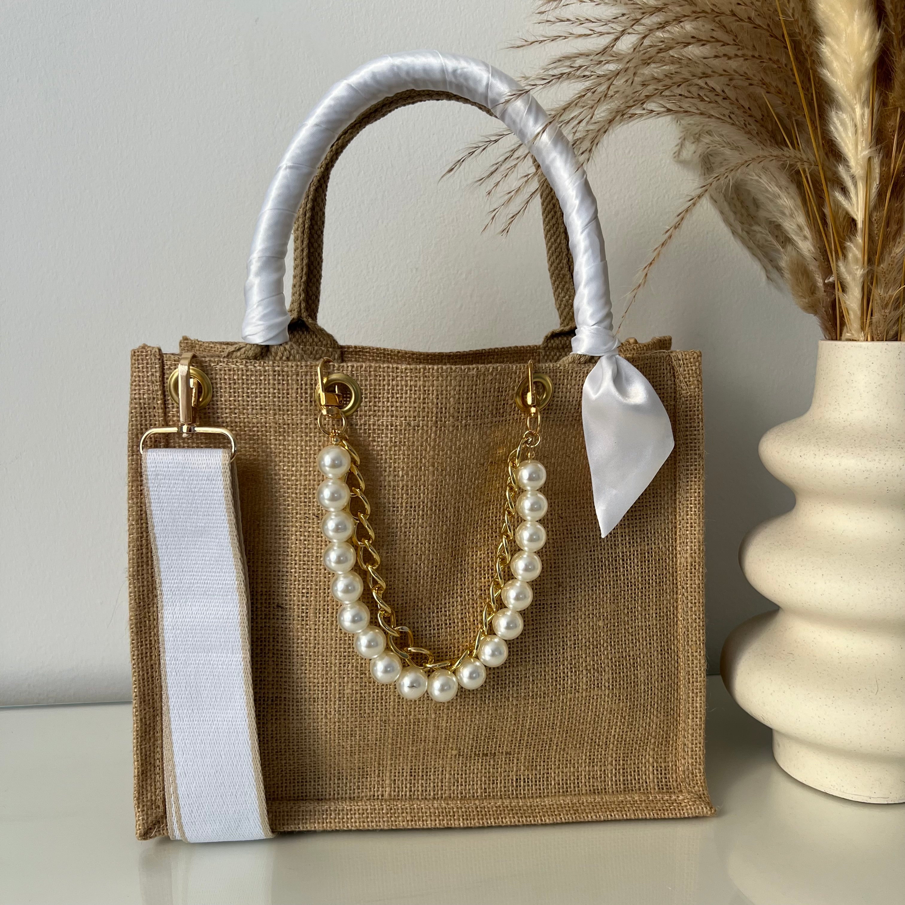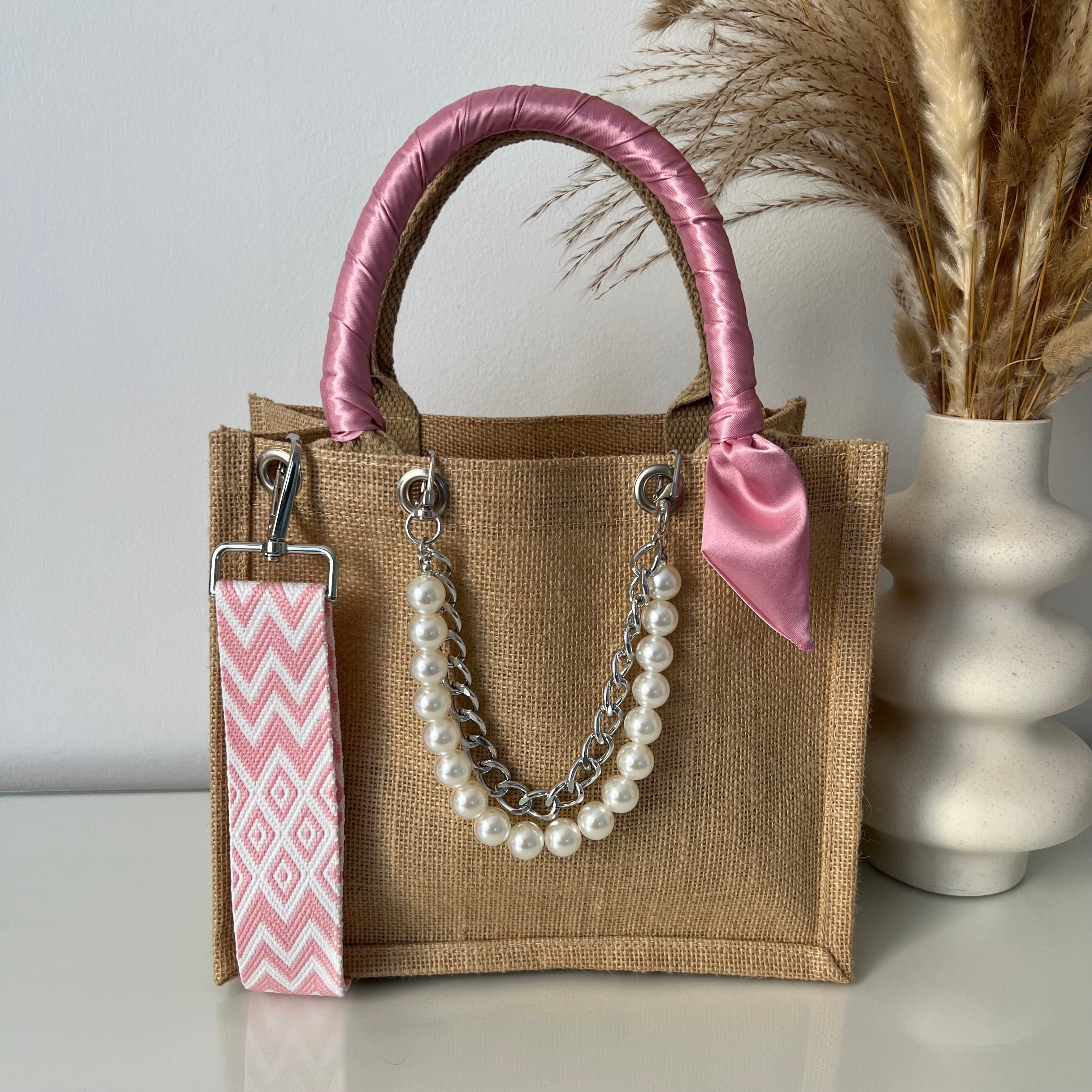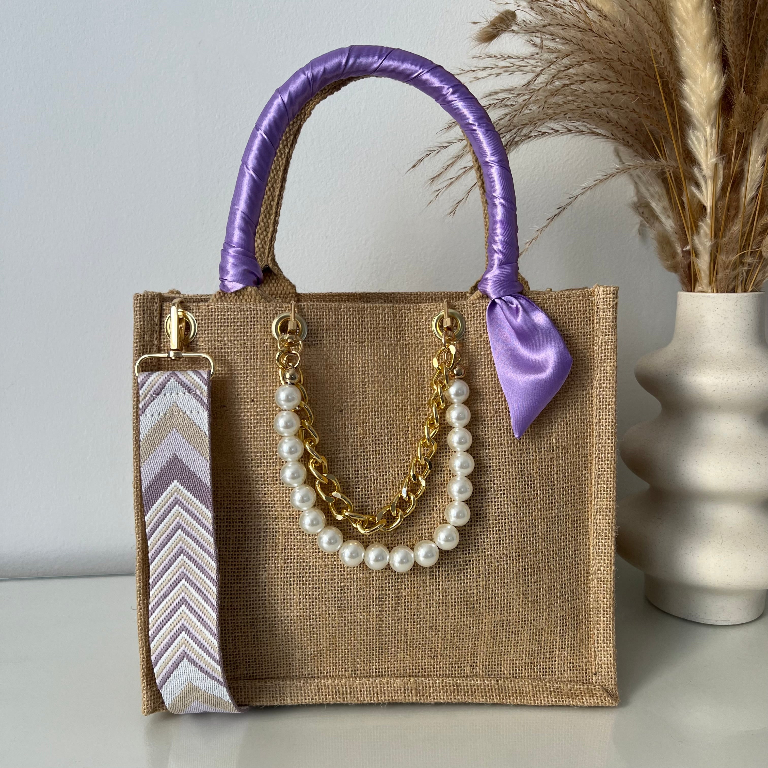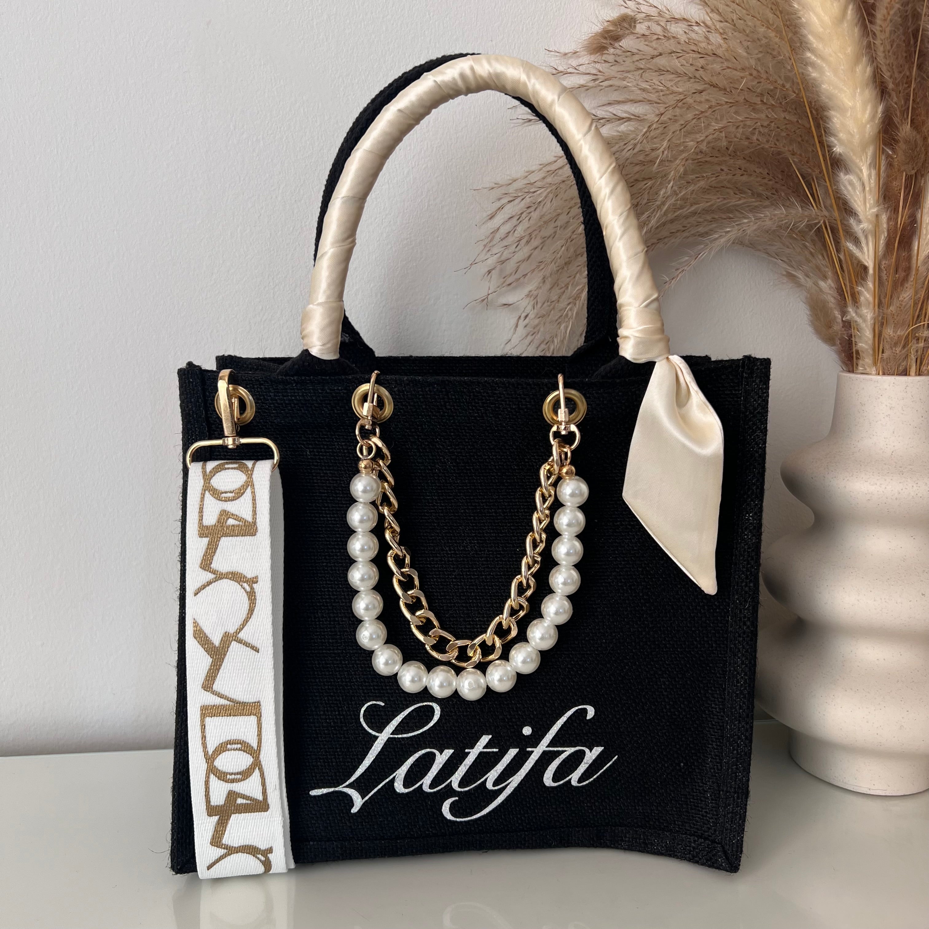 Sac en Jute Personnalisé avec Bijoux , Bandoulière, Foulard et Prénoms personnalisés.