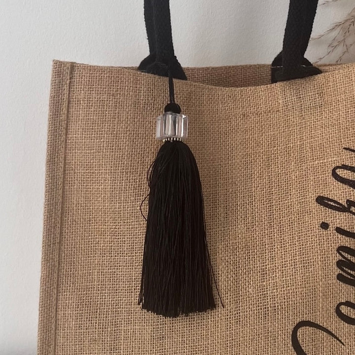 Sac en Toile de Jute couleur Naturel avec Lance Noire et petit Pompon bijoux de sac noir.